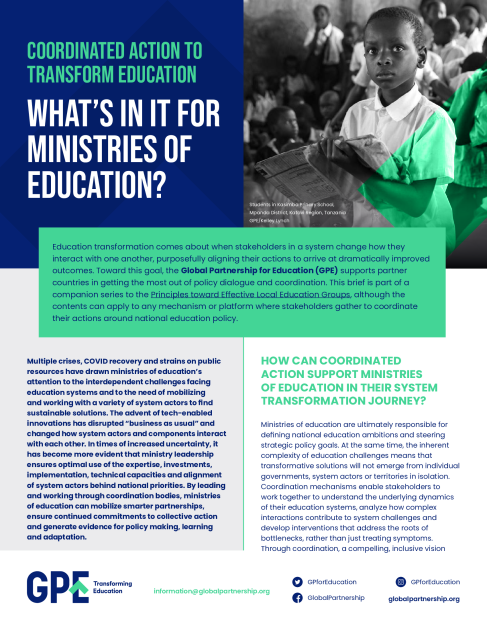 The series is a companion to the Principles Toward Effective Local Education Groups although the contents can apply to any mechanism or platform where stakeholders gather to coordinate their actions around national education policy and priority reforms.